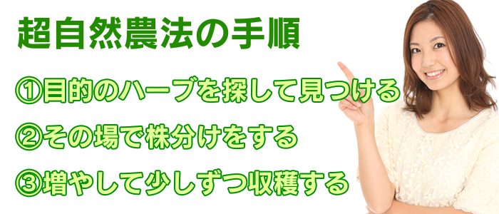 植物の好きな場所で、株分けをします。少しずつ、あまりたくさんにならないように。増やしすぎてしまうとそこは「畑」となり、『自然』ではありません。『自然』でなくなると、自然に戻そうとするため、虫や病気が発生するのです。ですから、超自然農法では、増やしすぎない、自然を崩さないという考え方で株分けをしていきます。